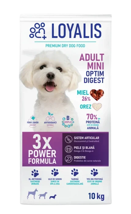 LOYALIS® Adult Mini OPTIM DIGEST este o formulă special concepută pentru câinii de talie mică, predispuși la sensibilități digestive, dermatologice sau articulare. Ingredientele atent selecționate susțin sănătatea digestivă, mențin o piele sănătoasă și blană strălucitoare, iar complexul de glucozamină și condroitină ajută la protejarea articulațiilor.