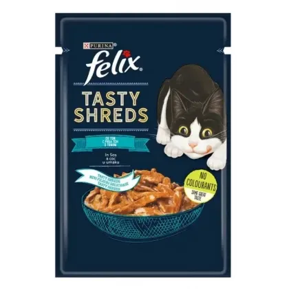 Felix Tasty Shreds cu Ton in Sos, Plic 85 g este o hrană umedă echilibrată, completă pentru pisici adulte, care furnizează acestora ingrediente valoroase, printre care acizi grași Omega-6 și vitaminele D și E.