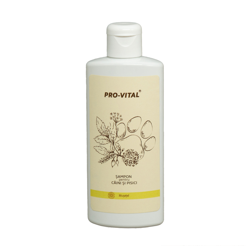 INDICATII : Se recomanda pentru intretinerea si igienizarea blanii la caini si pisici . Samponul Pro-Vital cu musetel calmeaza , revitalizaeaza si reimprospateaza pielea iritata, sensibila . Da luciu si stralucirii blanii . Datorita componentilor in lauriletersulfat de sodiu , cocoamidopropil-betain , cocodiethanolamid , ( fiind substante tensioactive - detergenti ) , dizolva si emulsifica murdaria. Parfumul din sampon are efect dezodorizant . Are proprietati antiseptice si antiinflamatoare .