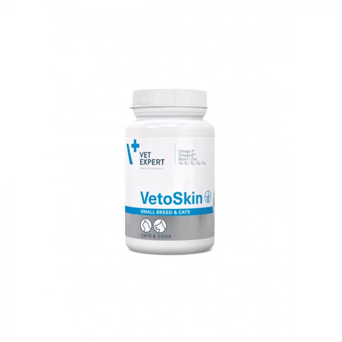 VetoSkin este un supliment alimentar pentru câini și pisici recomandat în tratarea afecţiunilor dermatologice, cu simptome ce includ piele uscată şi exfoliantă și căderi excesive de păr.